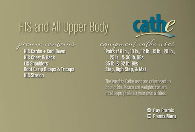 The above picture is submenu that appears if you select the “HIS and All Upper Body” Premix from the main premix menu. Each premix has a submenu page, just like this one, which will briefly describe what the premix is made of and the weights and equipment used by Cathe in the workout. Just hit “Play” and enjoy your premix.